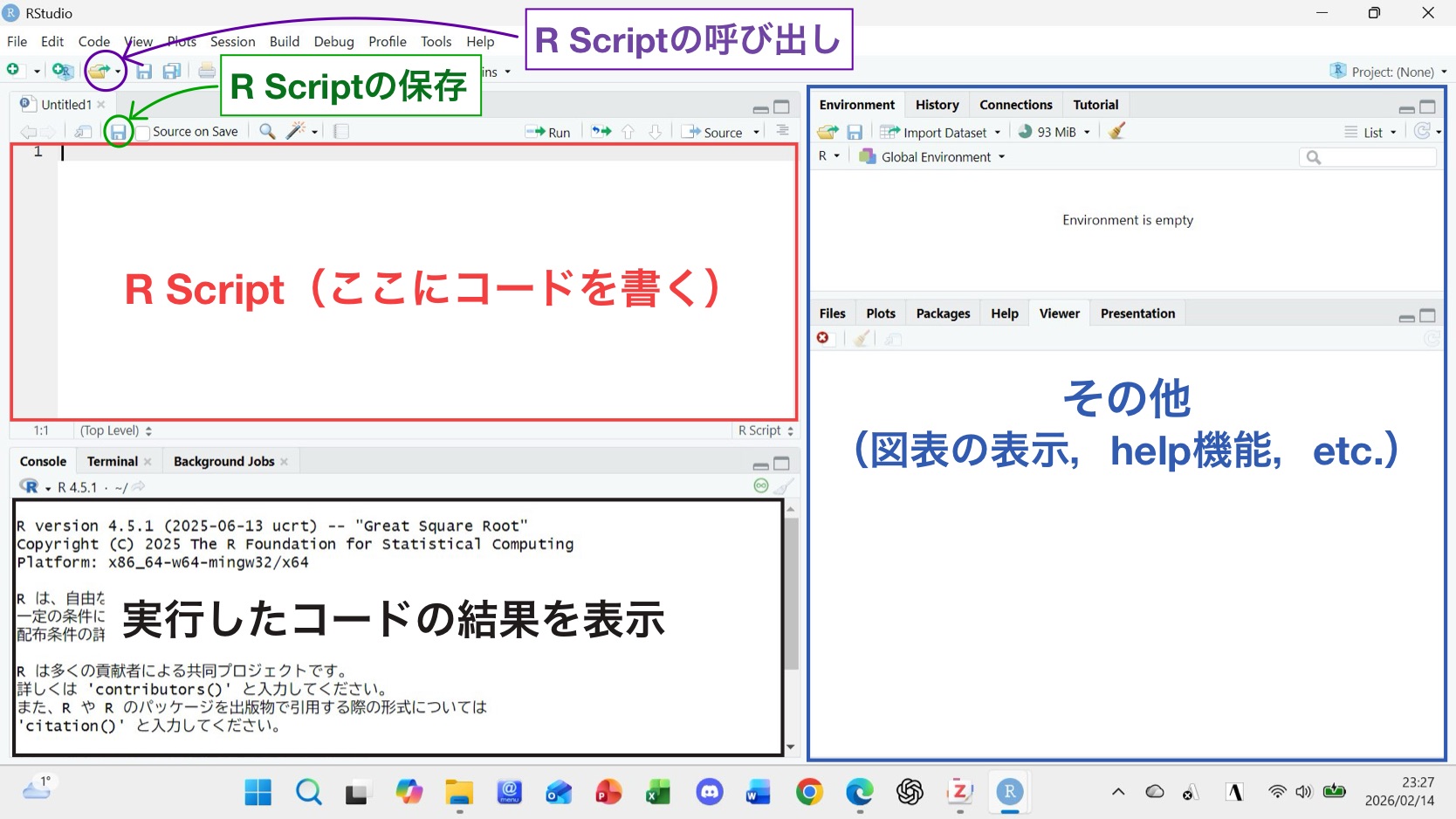 R Scriptを開くと下の画像のような状態となり、それぞれの部分がそれぞれの役割を有している。
